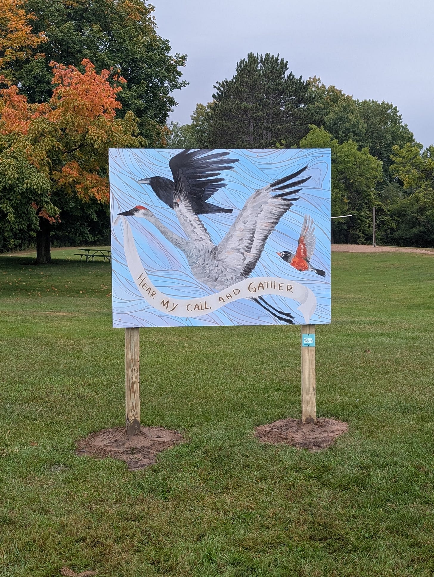 Instead of being able to use whatever materials we would have liked, we all created digital works that could easily be printed at a large size. I still didn’t know what any of the other pieces looked like, or what themes the other artists were building off of, but I pushed through with my design, and submitted my final piece. I ended up adding a robin, the Wisconsin state bird, and a raven, because I like them, joining the crane in flight to represent diversity. The grand reveal of the murals was a week ago, and I could not believe my art is on display at one of our local community parks!